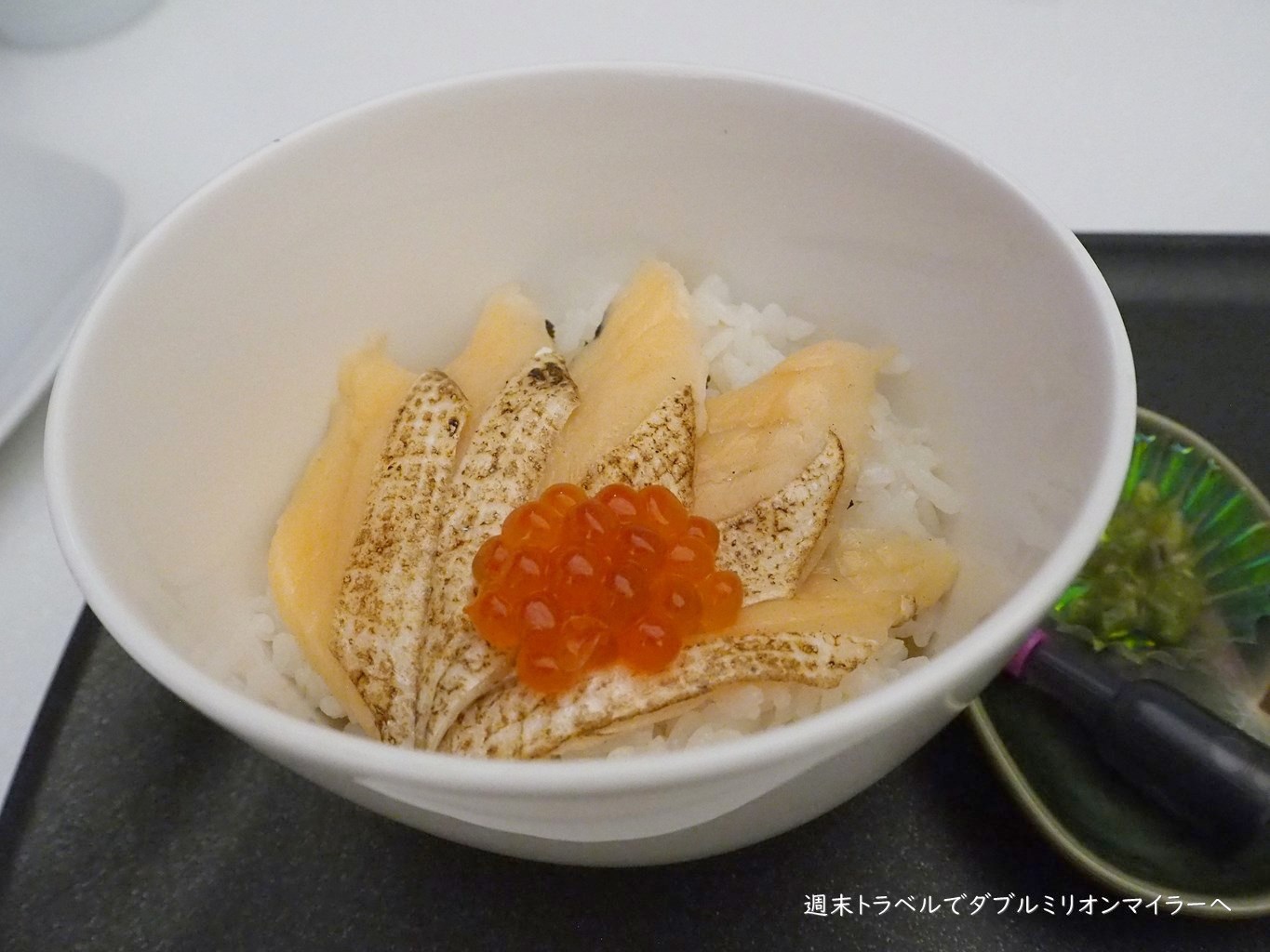 夫は鮭といくらの親子丼。夫はこのメニューが気に入ってて、ラウンジではよくこのメニューを選んでいます。