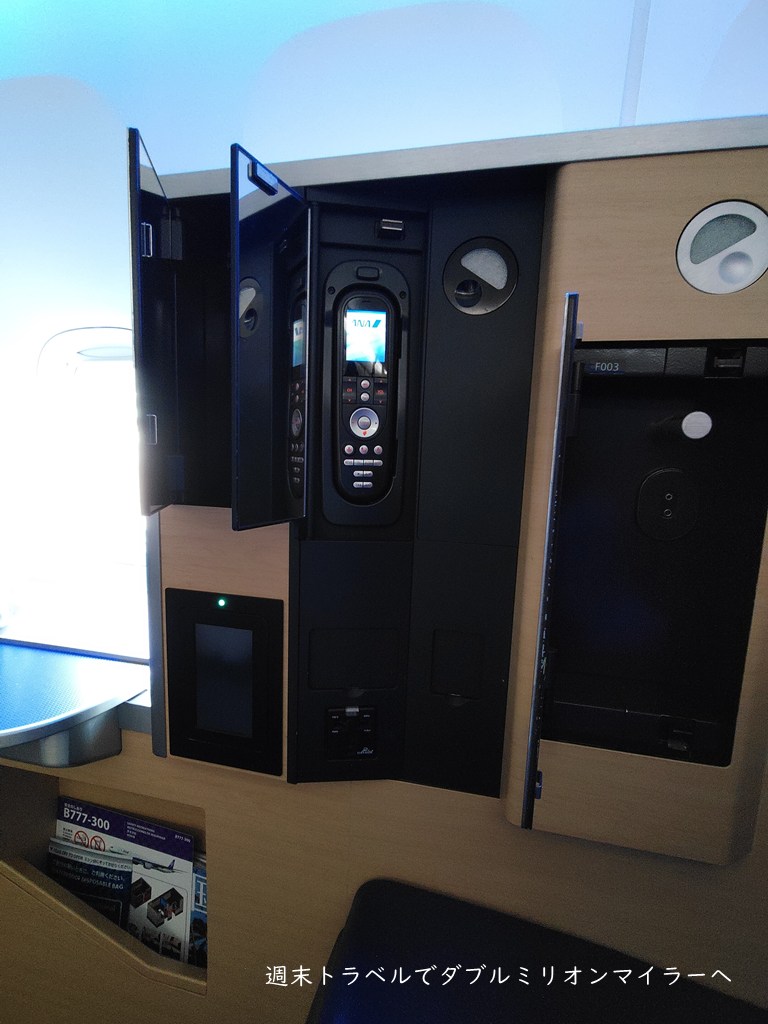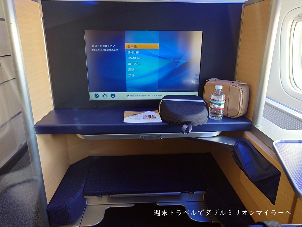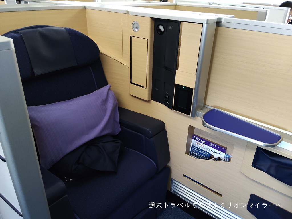 搭乗したフライトの機材は、777-300ERですが、「ANA FIRST SQUARE」と呼ばれる旧来の座席。スクエア型のシェルで囲まれ感があり、プライベートが保たれる設計ですが、扉がないタイプ。