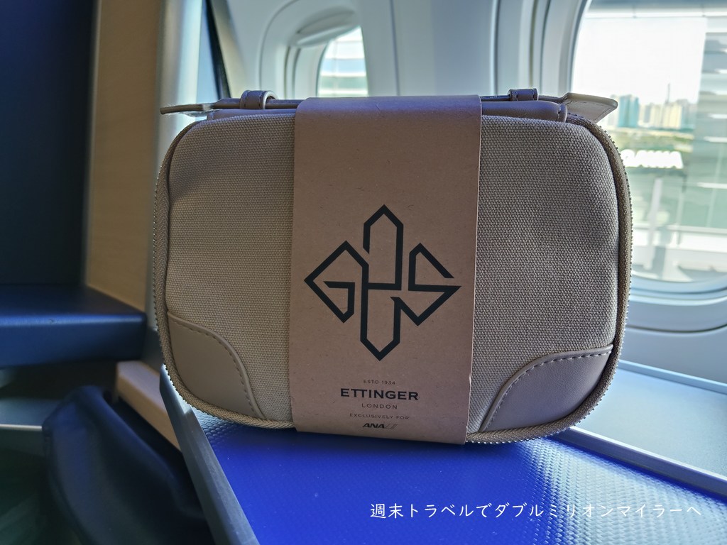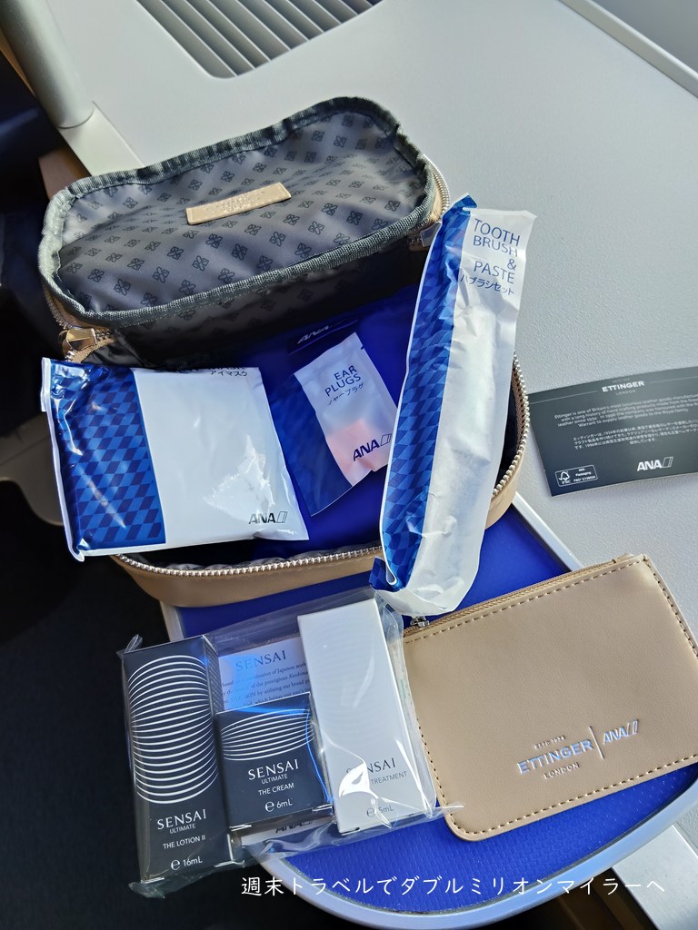 アメニティはエッティンガーの大型ポーチとミネラルウウォーター、ヘッドフォンなど。