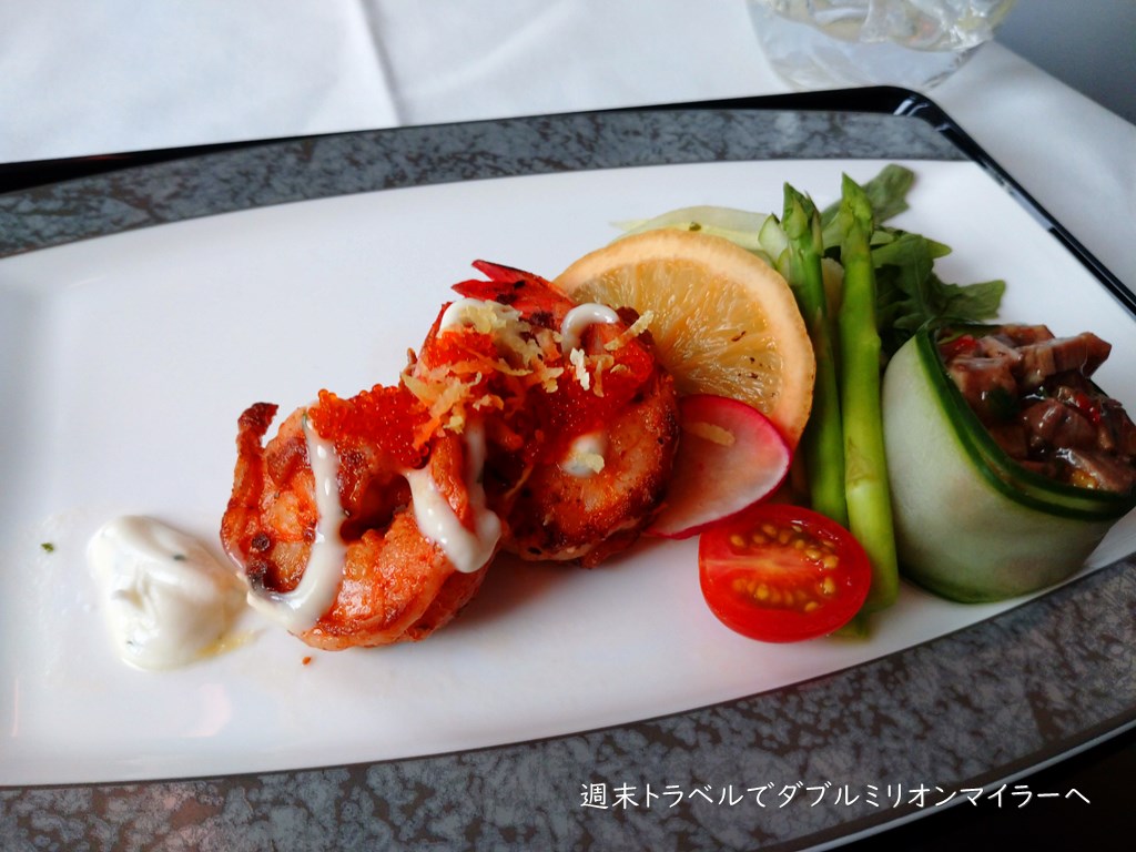 アペタイザーは海老のマリネヨーグルトミントドレッシングとタイ風ビーフ、主食はカイザーロールが用意されていました。