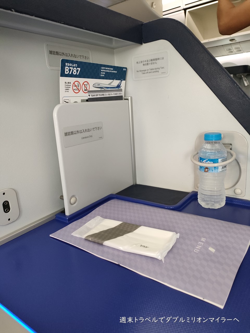 搭乗後、手荷物を整理して所定の場所に収めて席に着いた頃、メニューとおしぼり、水が配られました。