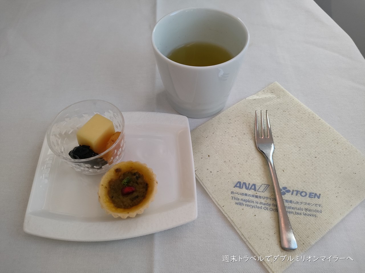 さらにしばらくすると、ウエルカムドリンクが配られました。この日用意されていたのは、グアバジュースと緑茶、夫はグアバジュースを選んでいたようです。