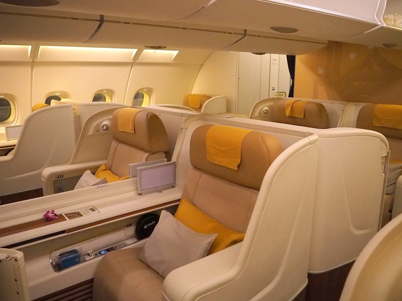 A380のファーストクラスは、他社のA380ファーストクラスと同様、フルフラットになる座席に大画面、そして、