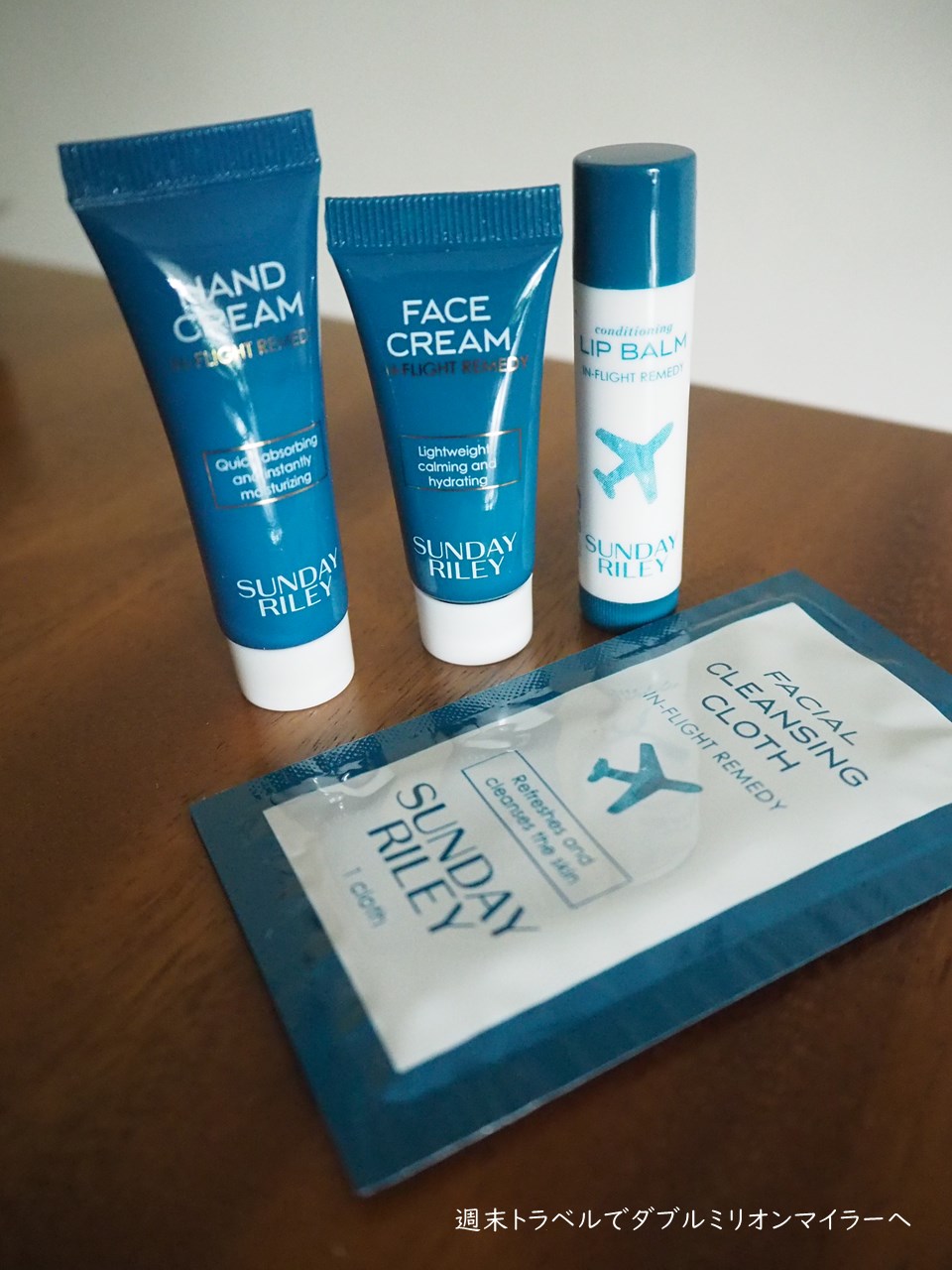 入ってたのは、ハンドクリーム、フェイスクリーム、リップクリーム、クレンジングクロス。機内で使いたくなるアイテムが選抜されています。立派な箱に入っていたのはびっくりです。