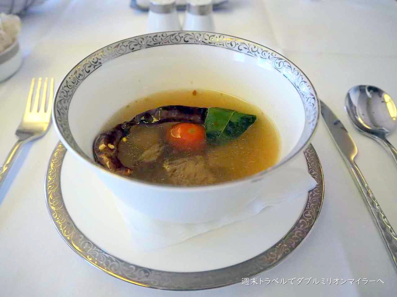 続いて、スープが運ばれてきました。牛肉をほろっと崩れるまで煮込んだもの。トムヤムクン味の酸味の効いたパンでした。