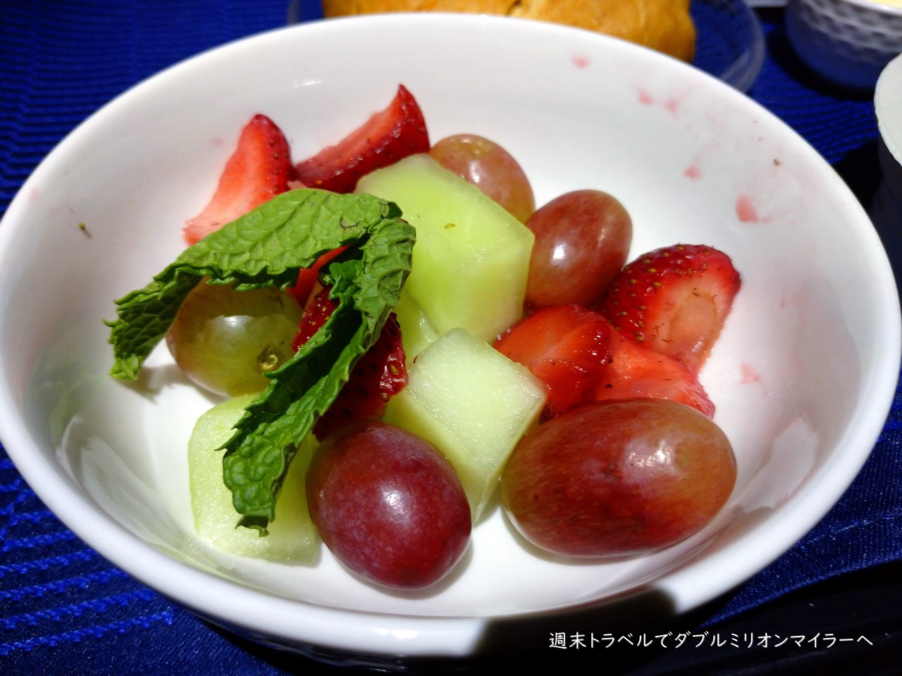 ユナイテッド航空の卵料理はあまり良い印象はなく、最初の機内食で和食をいただていたこともあり、夫婦ともにフルーツプレートをお願いしました。