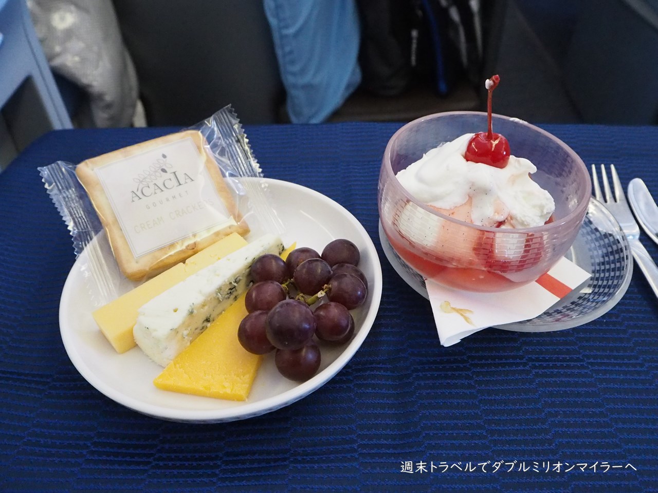 あらかじめアップグレードが決まっていたので、余裕の搭乗。スタッガードタイプの座席ではありませんが、フルフラットになる座席であっても、ポラリスビジネスクラスの利用ができることはありがたく・・・。機内食の後は早々に眠りにつきました。