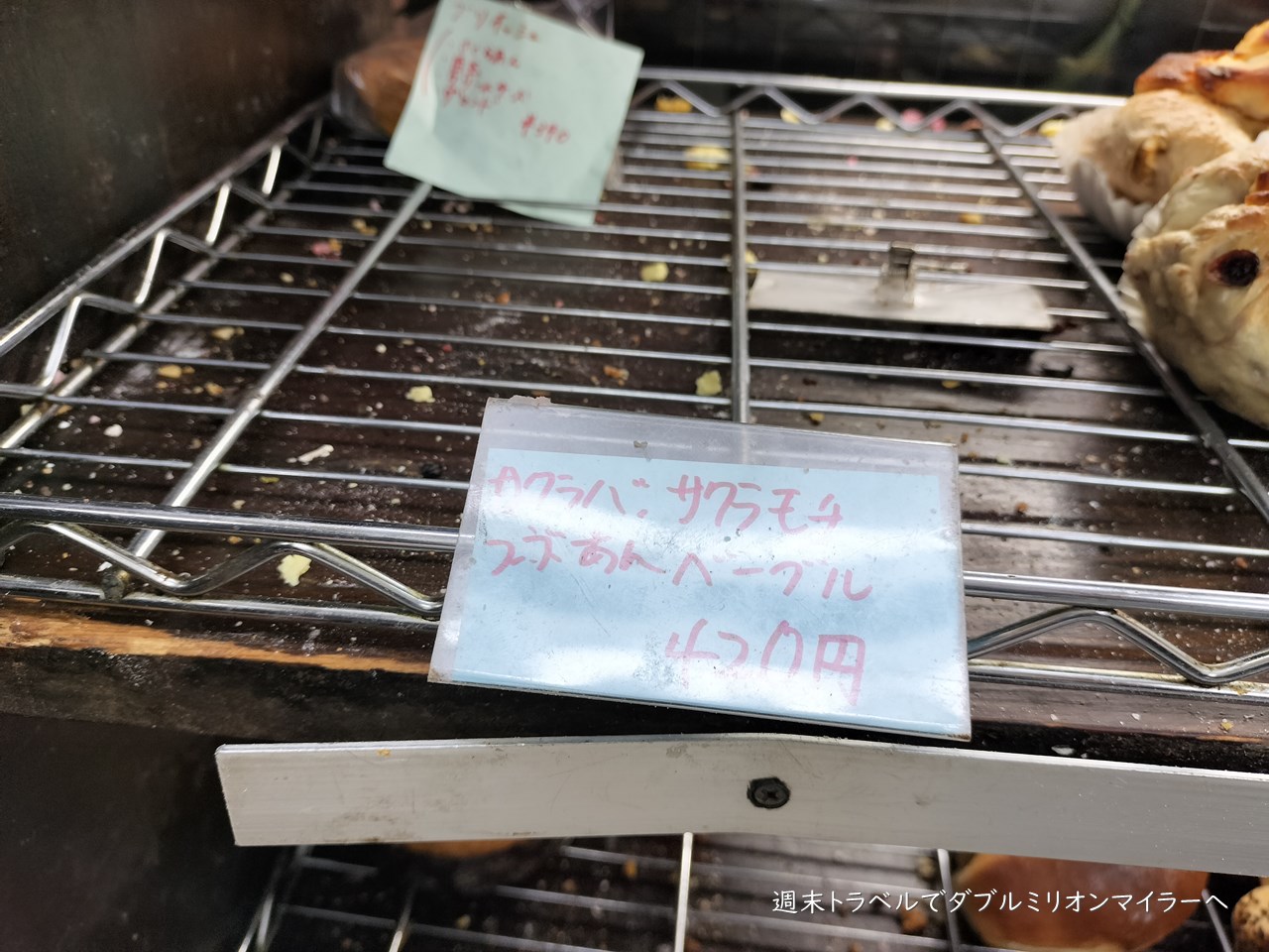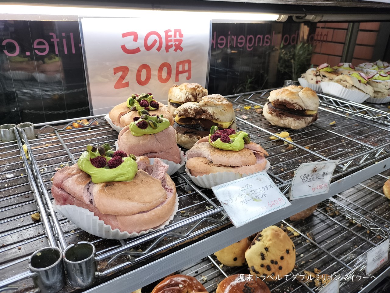 5分ほど待って店内に入りました。棚にはまだまだ多くのパンが並んでいます。200円の段にも、結構な種類のベーグルがあり、選び放題(笑)・フランボアーズにピスタチオクリームのベーグルサンド(640円)が200円になるのはとてもお得。春らしいきれいなベーグルですね。