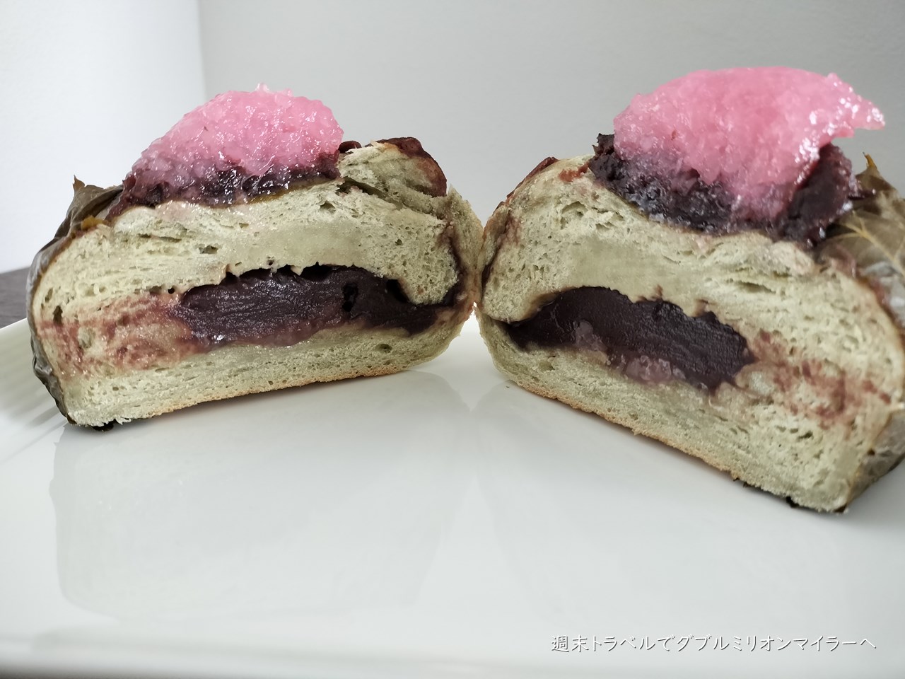 道明寺の部分は柔らかく仕上げられた粒が少し残るお餅、あずきのあんはしっかり甘みがついていて、桜の葉の塩味がアクセント、持ち帰って袋から取り出しただけで桜の香りが広がる桜感満点のベーグルでした。