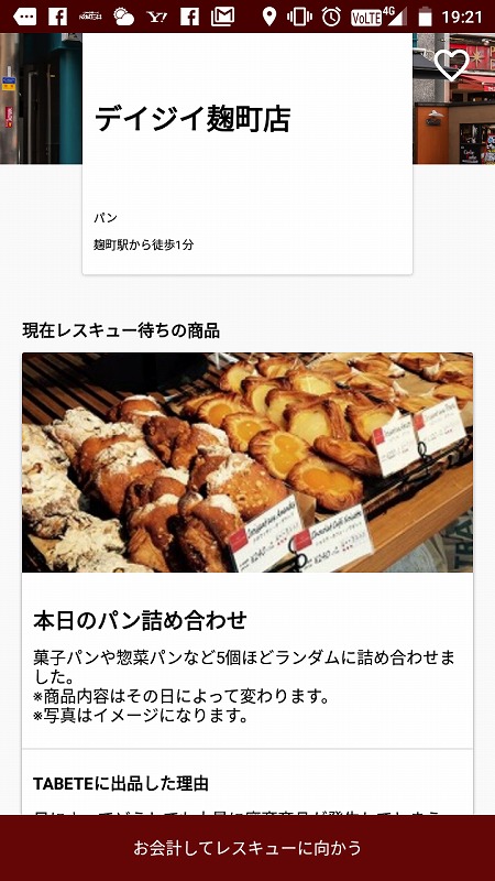 12月に入った平日、会社帰りにスマートフォンを見ると、「TABETE」からレスキュー依頼のプッシュ通知が来ているのを見つけました。どんなお店がレスキュー依頼を出していのか、店舗検索してみたところ、帰り道にあるパン屋さんが出品していることがわかり詳細を確認。