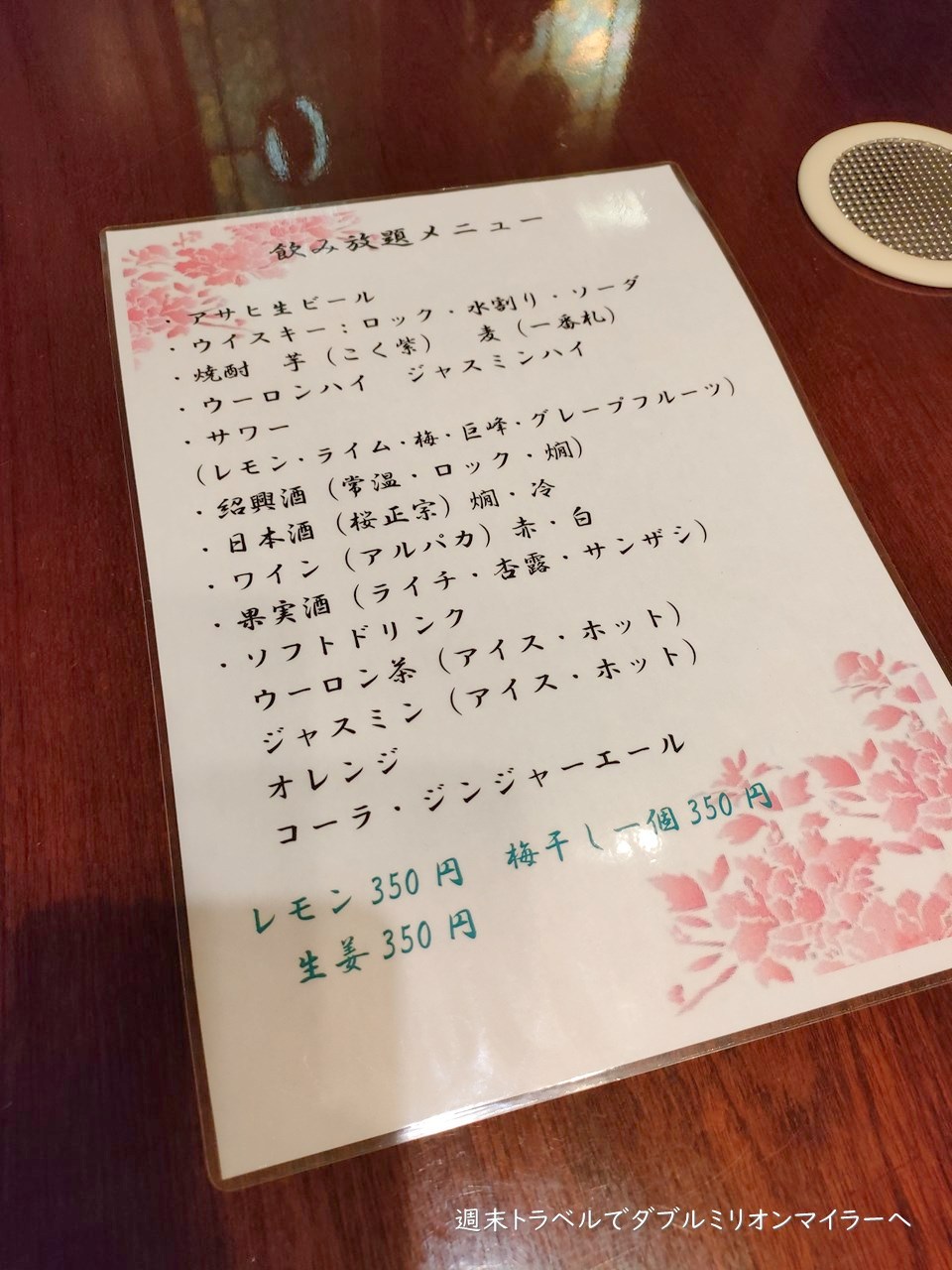 ビール(アサヒスーパードライ)/ウィスキー/紹興酒/日本酒/焼酎(芋・麦)/果実酒(サンザシ酒/ライチ酒/杏露酒/ワイン(赤・白)/サワー(巨峰・レモン・ライム・梅)など。