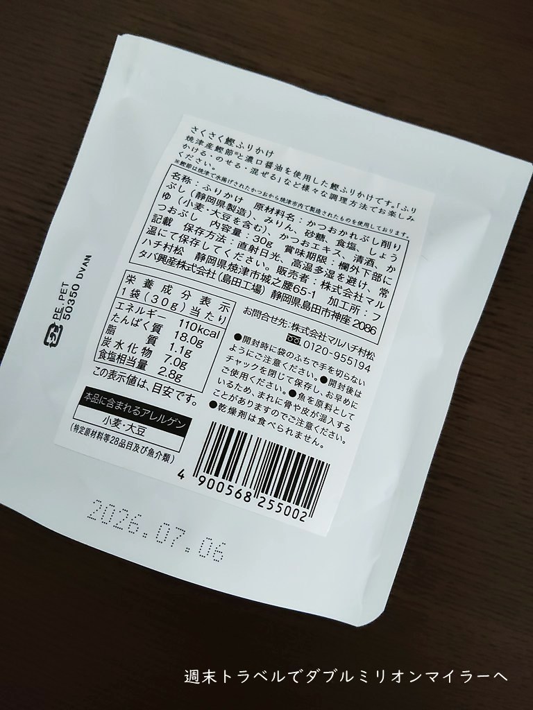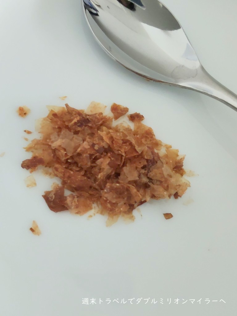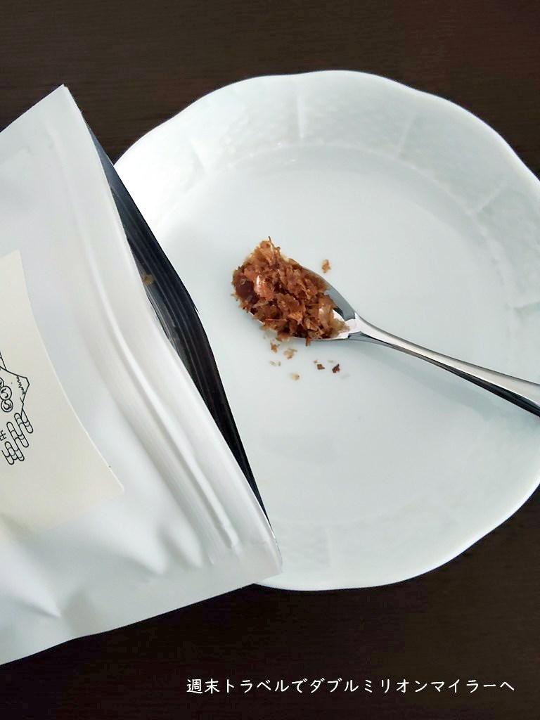 袋から出すと、ぱりぱりの鰹節がでてきました。花かつおよりも少し厚めに削られたもの、口に含むと、サクサクと音を立てる状態、心地よい噛み応えです。