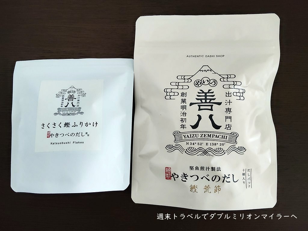 いただいたのは、「やいづ善八」のだしパック「やきつべのだし 荒節」、と「さくさく鰹ふりかけ」の2品、地元から離れて長くなりますが、静岡の良さを思い出させてくれる、そんな心遣いがをありがたく思いました。