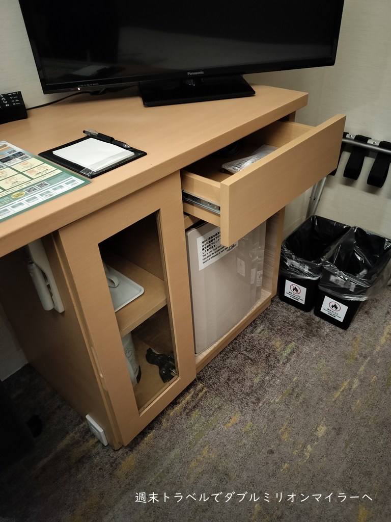 壁側にカウンターのデスクスペースとテレビ、冷蔵庫などがコンパクトにまとまって設置されています。