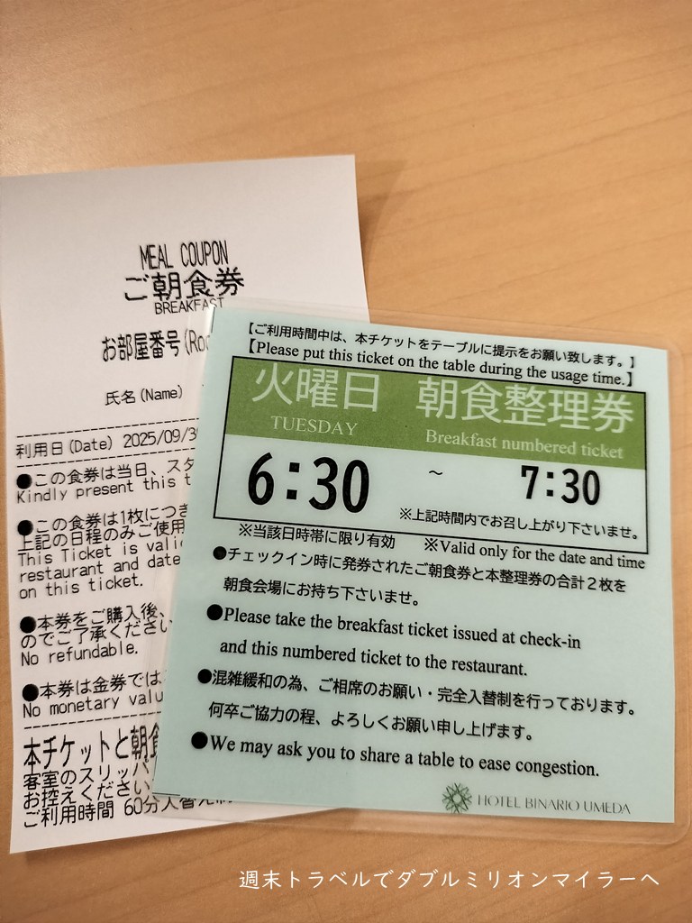 チェックイン機での手続きでは朝食券もいただきました。朝食は1時間の入れ替えの3部制、時間帯ごとに人数制限があるため、チェックインの時に時間帯を選び「朝食整理券」も受け取ります。