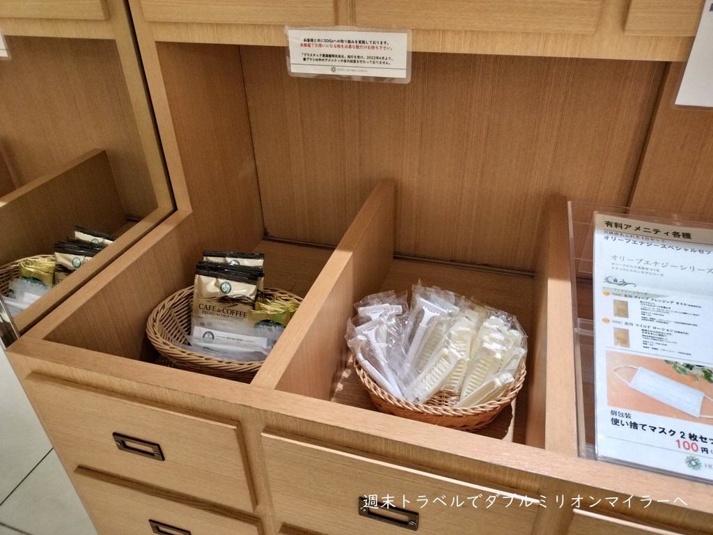 アメニティ類はロビー脇にあるアメニティーバーから必要なものをとっていく方式。必要最低限のものは揃っているので不便はありません。なお、化粧品は有料ですので、持参がお薦めです。