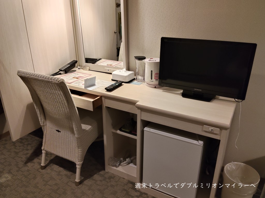 比較的大き目のスペース、鏡やコンセントの位置が適切など、メイクやPC作業がしやすい造りで快適。出張利用にも適した機能性を備えています。