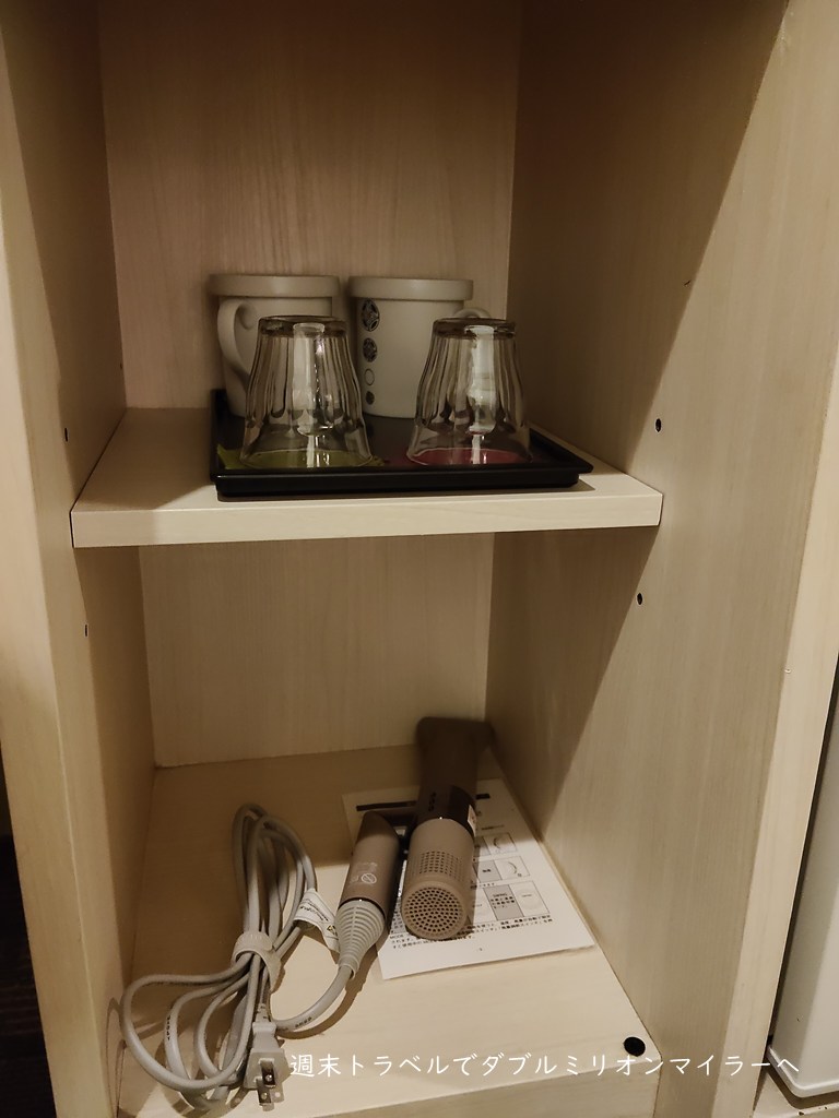 このほかの室内アメニティは、ごく一般的。パジェマはセパレートではなくワンピーススタイル、ドライヤー、スリッパなどはよく見かけるタイプのものでしたので、持参のものを使いました。