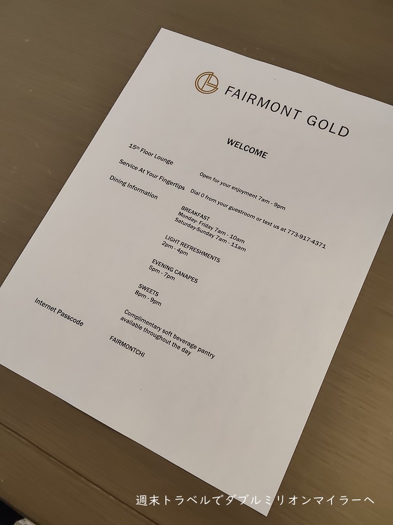 シカゴの冬は氷点下の気温になるなど東京よりもずっと寒く、外歩きの観光は結構つらい時期。年末年始はホテルでのんびり過ごそうと、今回の滞在では、フェアモントゴールドの部屋を予約。ラウンジサービスを利用させてもらいました。