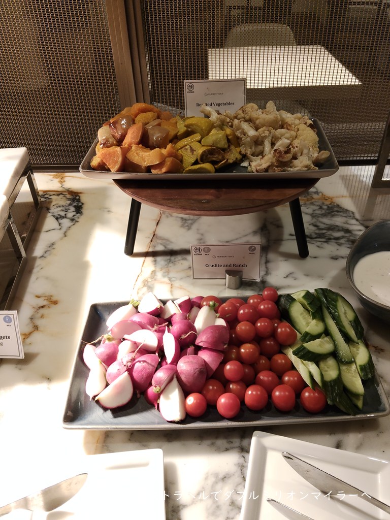 品数は少な目ですが、クオリティは高く美味しいものばかり。野菜とチーズ、ハムにクラッカーの組み合わせで軽い食事代わりにもなる内容でした。