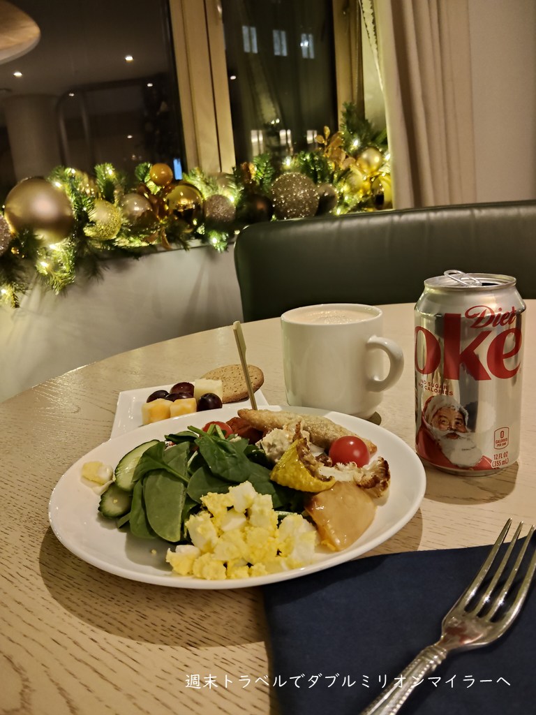 ラウンジから眺める夜景もなかなか。雪が積もる銀世界に街灯などが灯ると幻想的な雰囲気、冬らしいホリデーシーズンの景色を見ながらひと時を過ごしました。