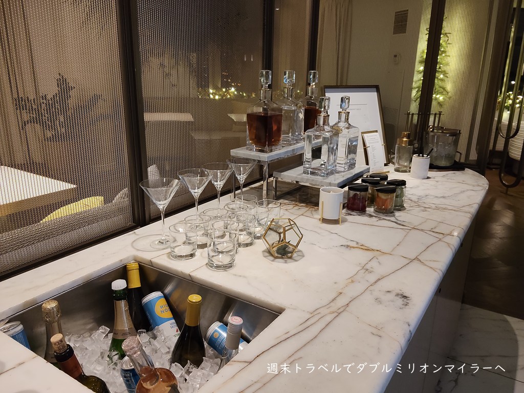 ビュッフェ台の一部がバーコーナーになり、アルコール類が提供されています。
