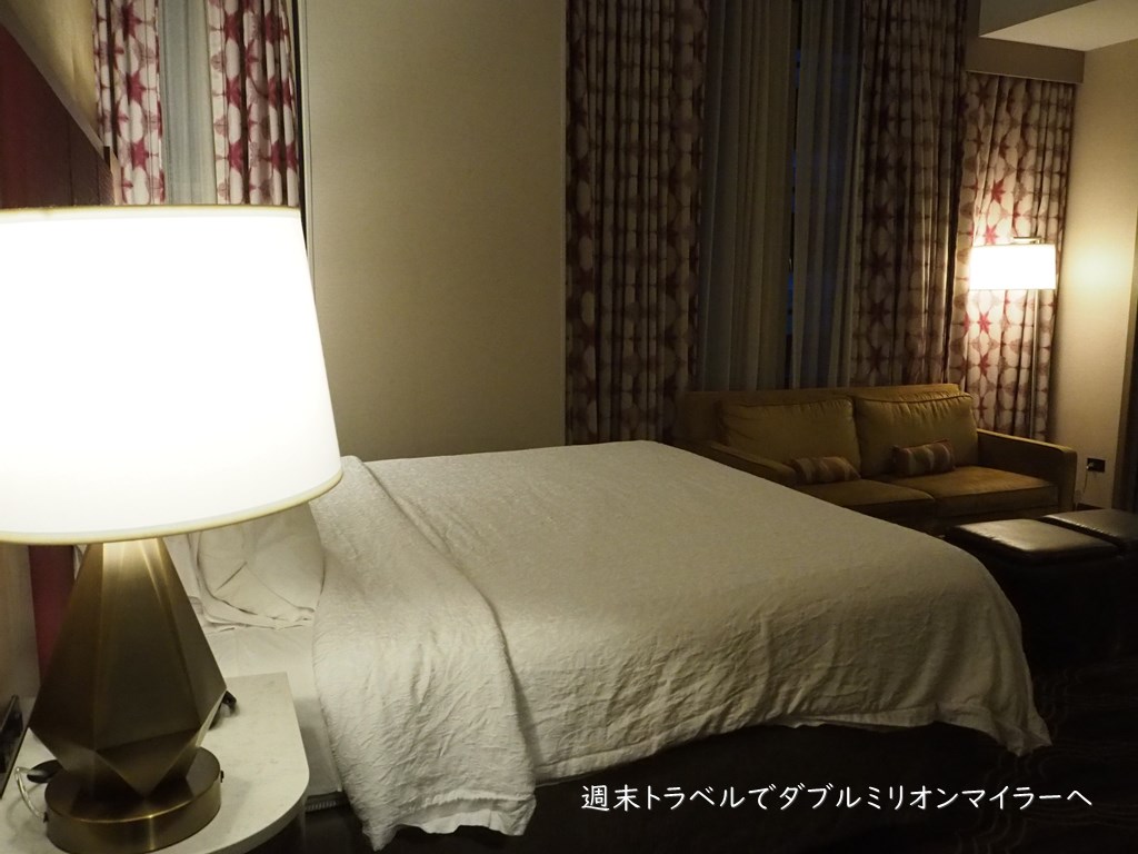 予約していたのは、一番お安いカテゴリーの「1 KING BED」でしたが、ヒルトンオナーズゴールド特典でアップグレードされ、「1 KING BED WITH SOFABED」がアサインされました。