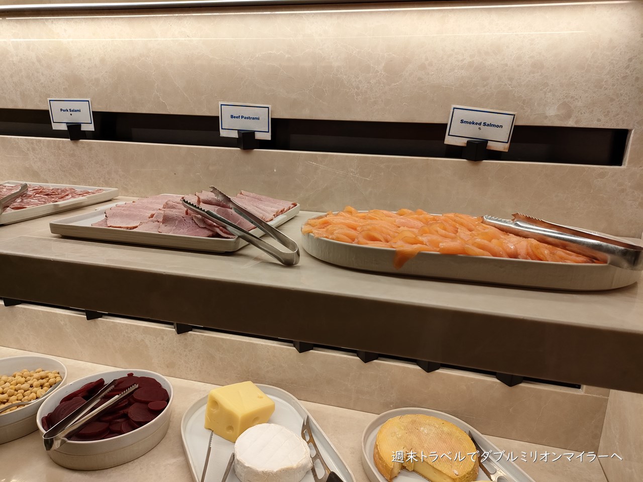 ラウンジ内のビュッフェ台に温かいお料理、パン、シリアルなど、壁側には冷蔵ケースがあり、冷たいお料理が並びます。