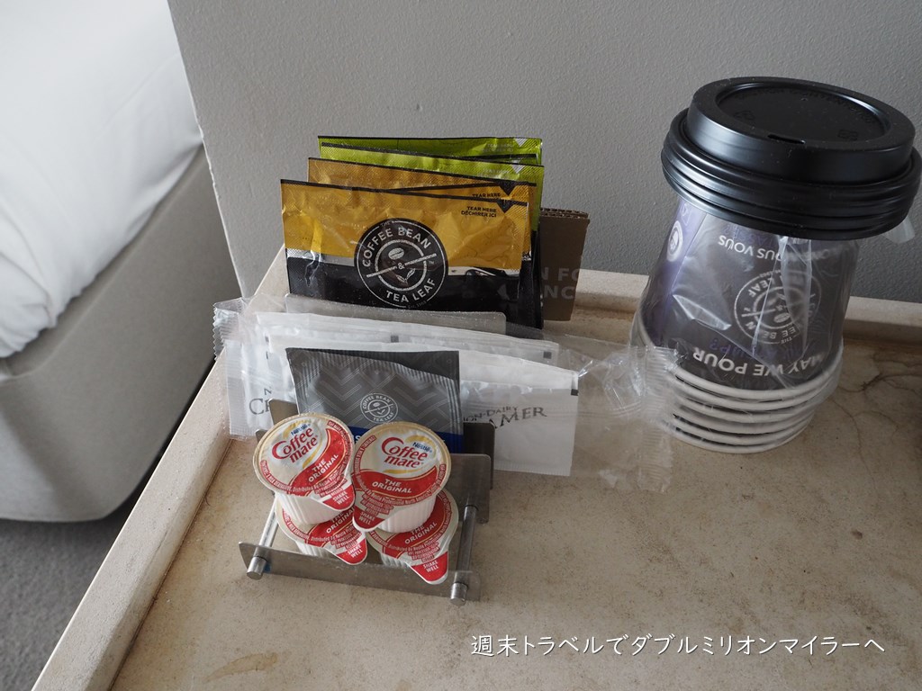 入口近くのチェストの上にアメニティが置かれていました。コーヒーメーカーはクイジナートのもの、ミネラルウォーターが2本はゴールドメンバーへのサービス。