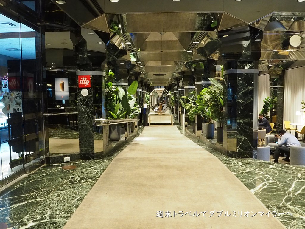 ロビーからエレベータホールに続くエリアも鏡を多用した内装で華やか。