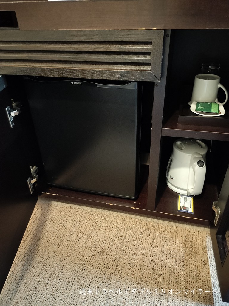 テレビ台の下には冷蔵庫と電気ポット、お茶セットなど。冷蔵庫はしっかり冷えるタイプ。最近は夜間の動作音を考慮した冷却機能が弱い「保冷」機能のみの冷蔵庫を置いているケースがあるのですが、じちらは普通の冷蔵庫でありがたい。