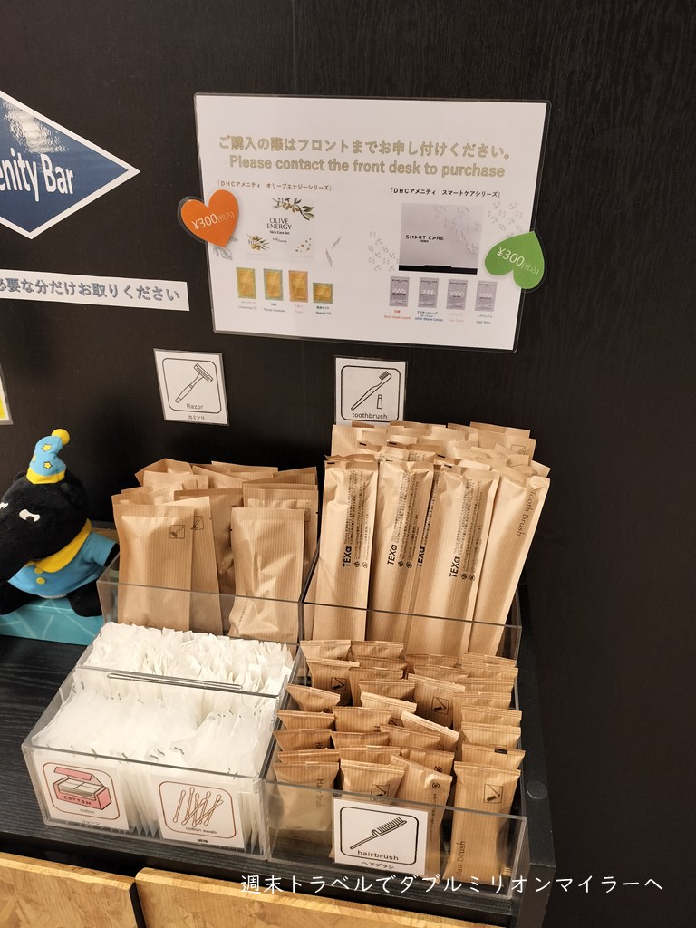 必要なアメニティは自分で部屋に持っていくスタイル、歯ブラシ、かみそりなど最低限の用意、化粧品類は有料で販売されていました。