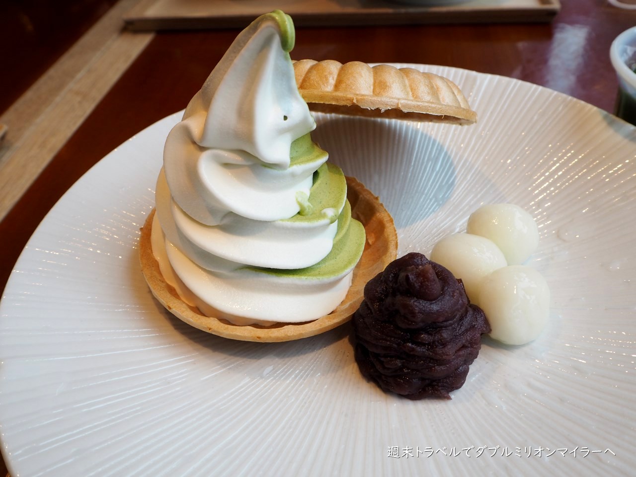 ソフトクリームは、ミルク、抹茶、ほうじ茶、ミルク&抹茶、ほうじ茶&抹茶から選べるもの。抹茶にしようかと思ったのですが、ソフトクリームそのもののお味も試したかったので、抹茶とミルクのミックスを。