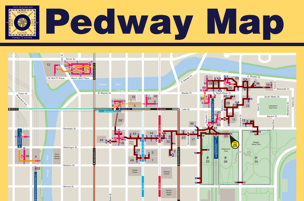 シカゴ中心部には、「PEDWAY(ペドウェイ)」と呼ばれる地下道が張り巡らされています。これは、ダウンタウンの主要ビルや駅、公共施設を地下で結ぶ通路で、地元の方は利用している、都市インフラです。