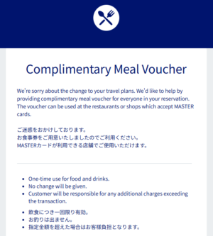 しばらくすると、さらに出発時刻が変更され、最終的には2時間を超える遅延に。その連絡と一緒に送られてきたのが、「Your meal vouchers」というメール。
