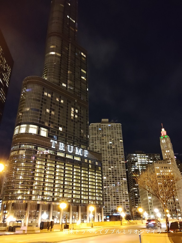 朝5時台のシカゴは夜明け前で真っ暗。シカゴリバー沿いに立つトランプタワーの前は人通りがなく、車の通行も少な目。