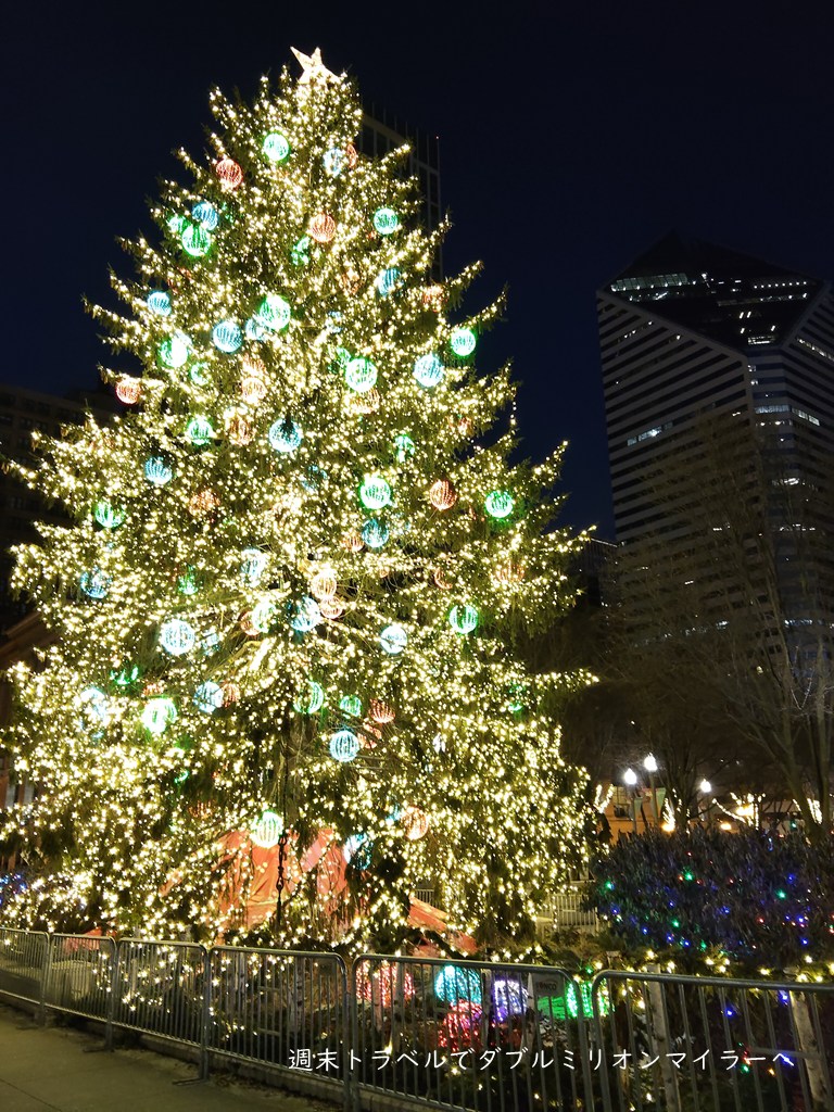 公園の木々はクリスマスイルミネーションで輝いています。