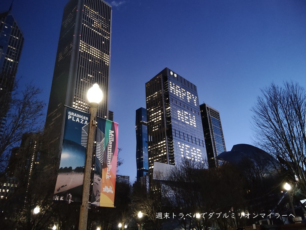 ミレニアムパーク近くのビルには、室内照明で「HAPPY NEW YEAR」のメッセージ、現地では気がつかず、帰ってきて写真をみて気がつきました。