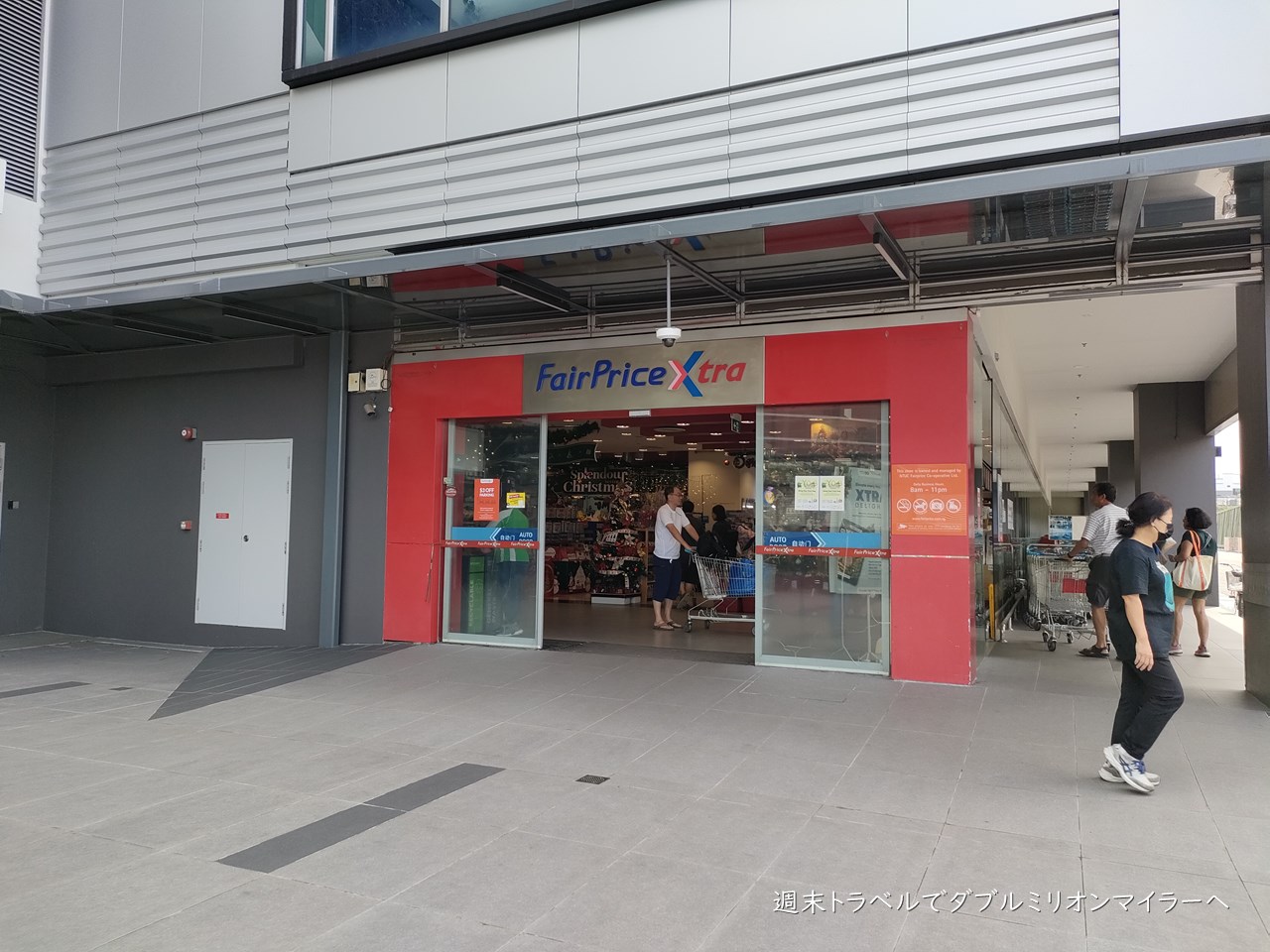 駅を降りて左手にあるビルの1階にあるのが「フェアプライスエクストラ」、エクストラの名前の通り、巨大なハイパーマーケット、食料品のほか、衣料品、日用品雑貨を扱う店舗、通常の食料品中心のスーパーマーケット「フェアプライス」とは異なる品揃えです。