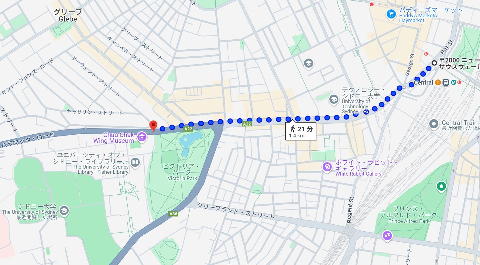 セントラル駅から大学の入り口(上の地図の赤いポイントの場所)まで徒歩20分ほど、大通り沿いをまっすぐ進むだけなので、とても分かりやすいルートです。