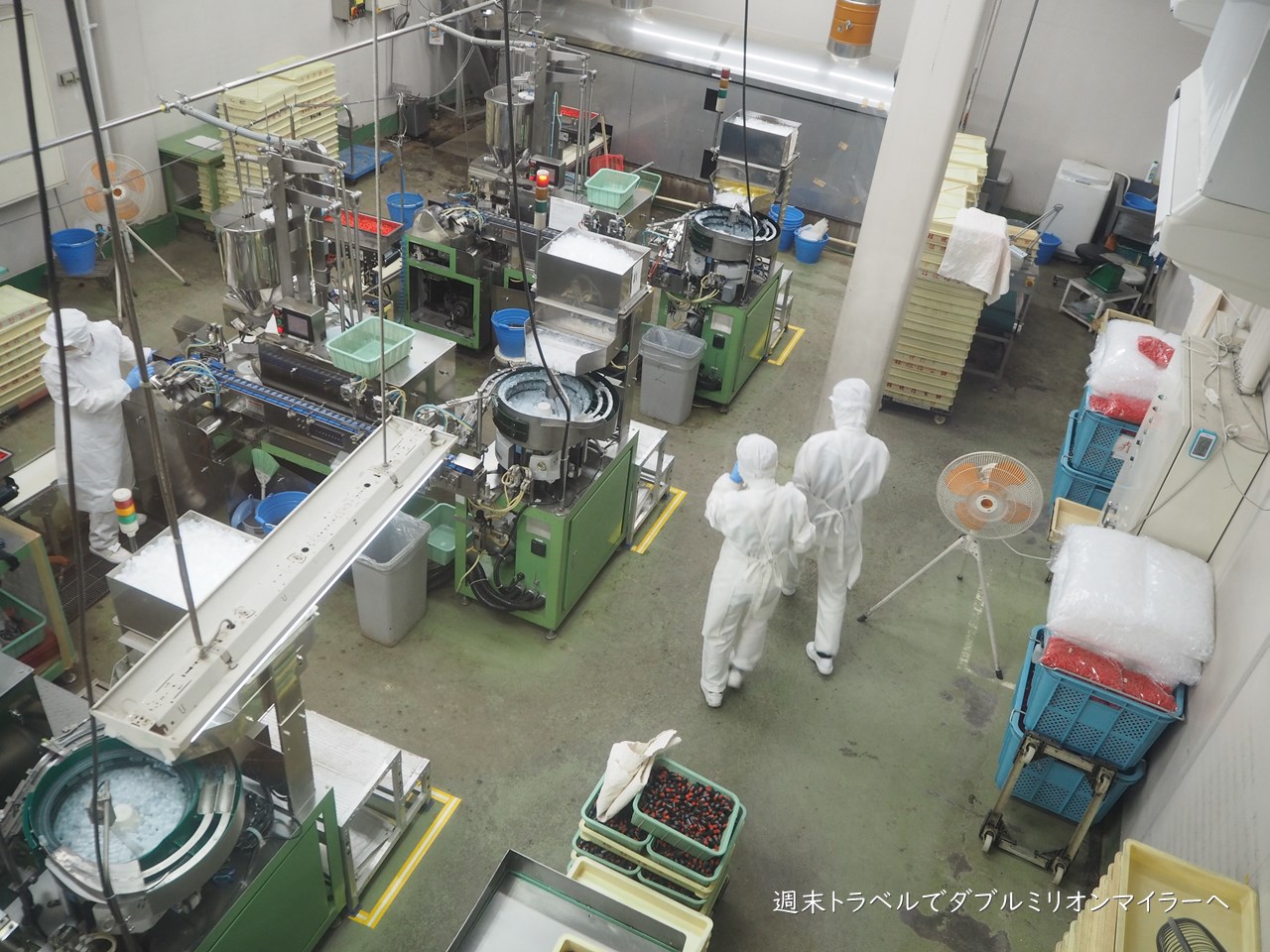 工場内には制服に身を包んだ従業員の方が忙しそうに動いていらっしゃいました。残念ながら、出来上がった製品を包むラインは稼働しておらず、スタッフの素早い包装技は見学できませんでした。