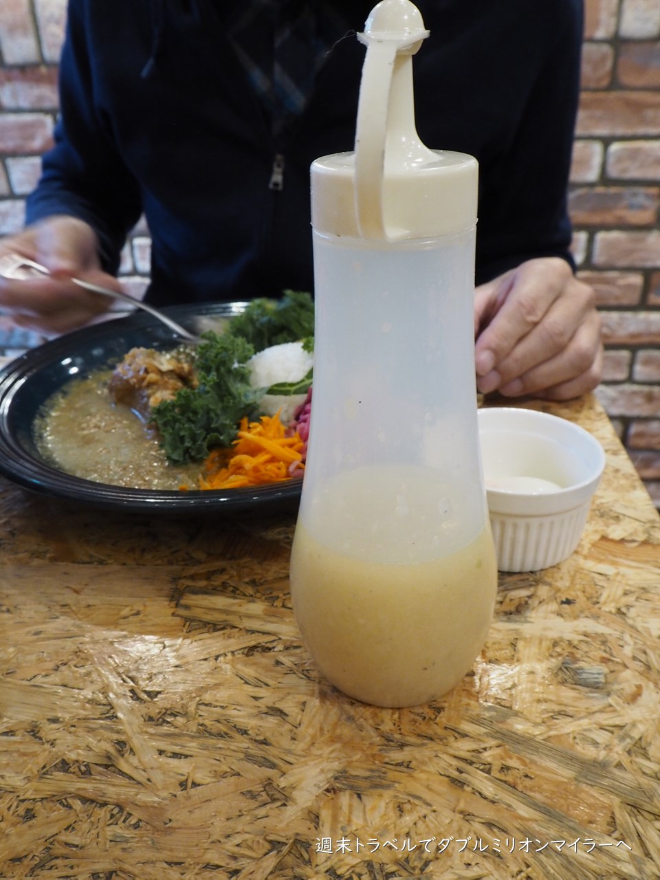 一緒に来たのは、ドレッシング。添えられているケールのサラダにかけていただくようですが、カレーの味が濃いのでドレッシングは不要。