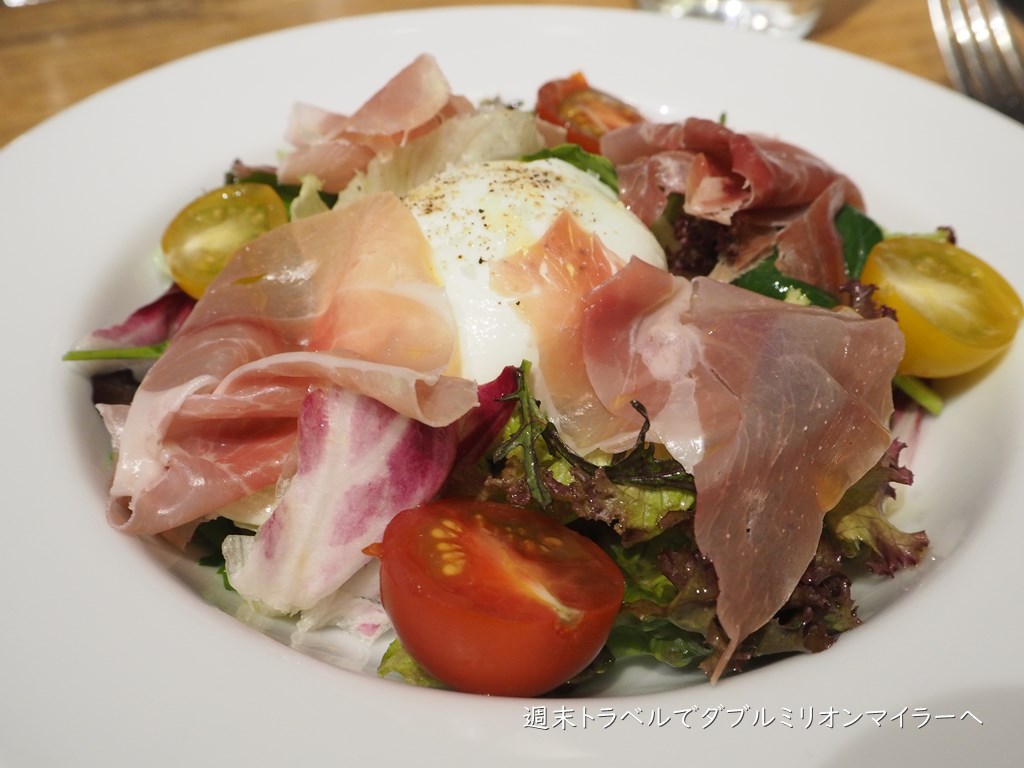 夫は大好きな生ハムのサラダを選択。こちらも塩味が効いた生ハム、シンプルなドレッシングだけで美味しくいただけるもの。チーズはさっぱりした味わいのものでした。