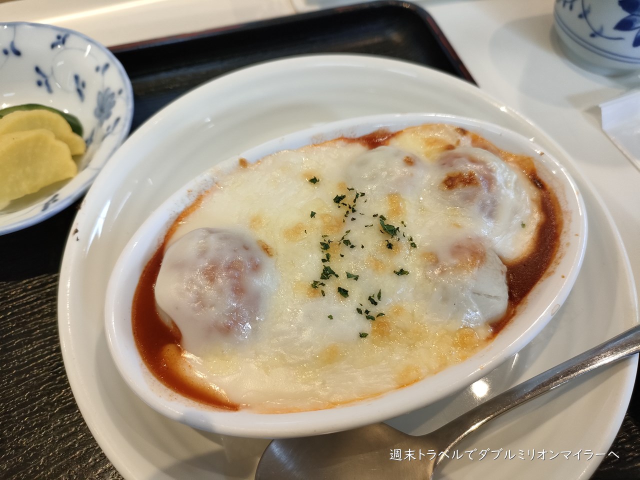 さといものグラタンという名前からは想像がつかなかったのですが、小さくころころしたサイズのさといもにトマトソース、ベシャメルソース、チーズをかけて焼いたものでした。トマトソースが甘めで、和風を感じるグラタン、ご飯に合うようなお味にしているのだと思いました。