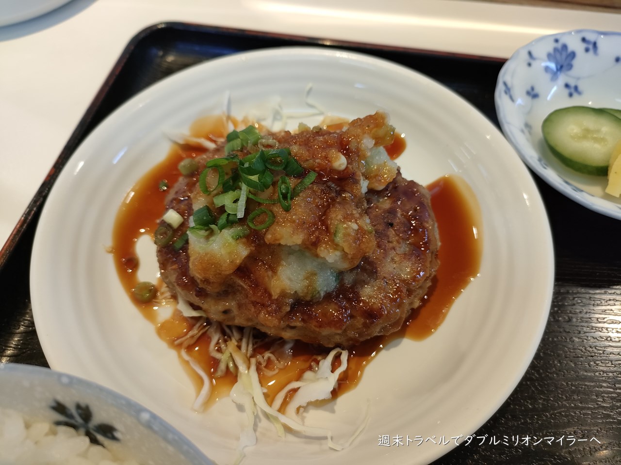 最後のメインは、おろしハンバーグ。懐かしいタイプのハンバーグ、柔らかく食べやすいもの。おろしソースに粘りがあって食べやすいなと思ったら、刻んだおくらが入っていてまとめていると分かりました。ソースをしっかり絡めてハンバーグが味わえるように工夫されていました。