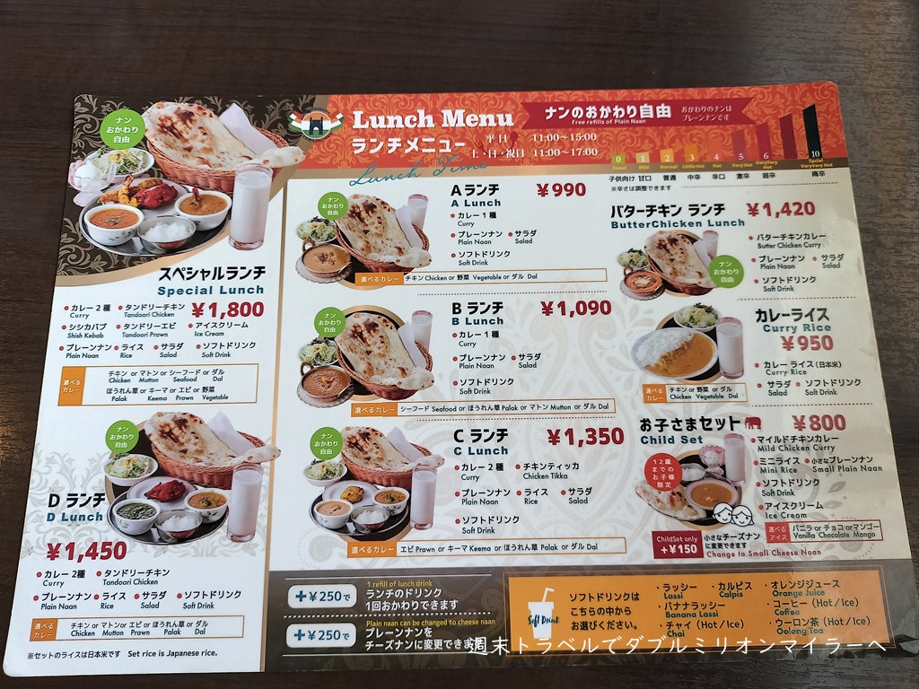 ランチのカレーセットはカレーの種類や数などが異なるA~Dの4種類のほか、シシカバブやアイスクリームなどが付くスペシャルランチなどがあります。我が家はいつもカレー1種類のセットのAまたはBランチ、その日に食べたいカレーの種類で決めています。