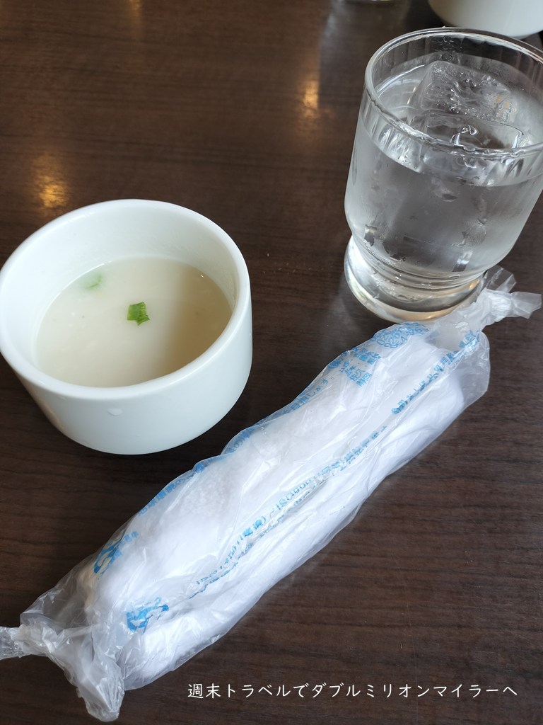 最初におしぼりと、サービスのスープが来ました。ニンニクが効いたクリームスープ、夫はこのスープが好きでいつもうれしそうに飲み干しています。