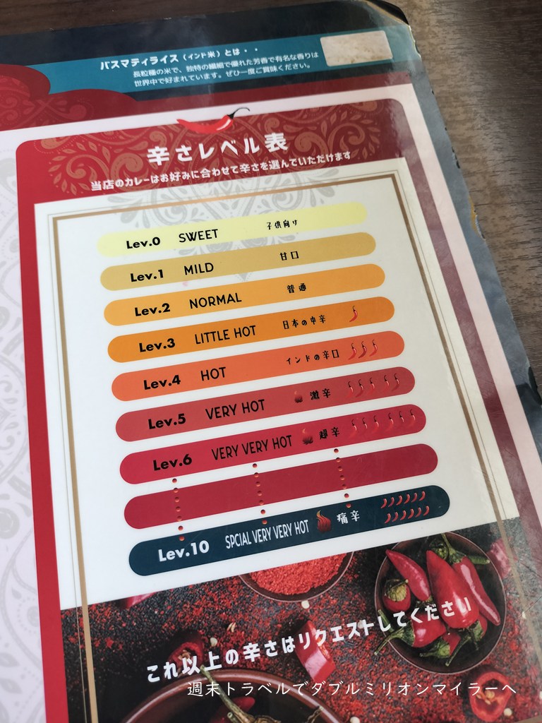 カレーの辛さは選べます。平均的な日本人に心地よい辛さはレベル3あたり、一度辛いものがよいかなとレベル4をお願いしたことがありますが、辛すぎて味わえなかったので、レベル3と控えめにしています。