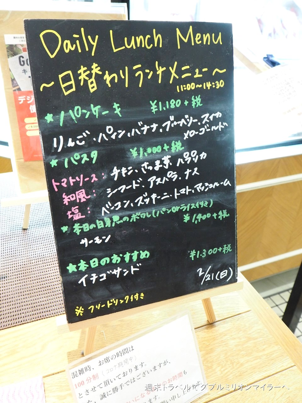 店頭には日替わりのランチメニューの案内、パンケーキのフルーツやパスタの種類などが紹介されています。