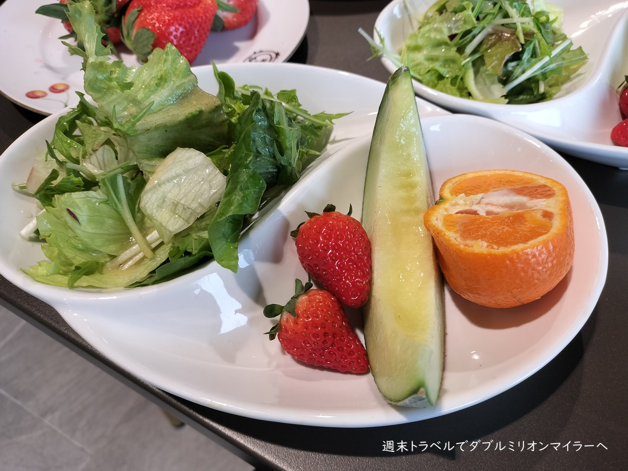 驚いたのは、食事のセットとして、サラダフルーツセットが提供されたこと。メニューの案内には記載がありませんでしたが、普段、食事メニューにはサラダとフルーツが添えられているので、食べ放題の時もその運用が継続されていたもの。